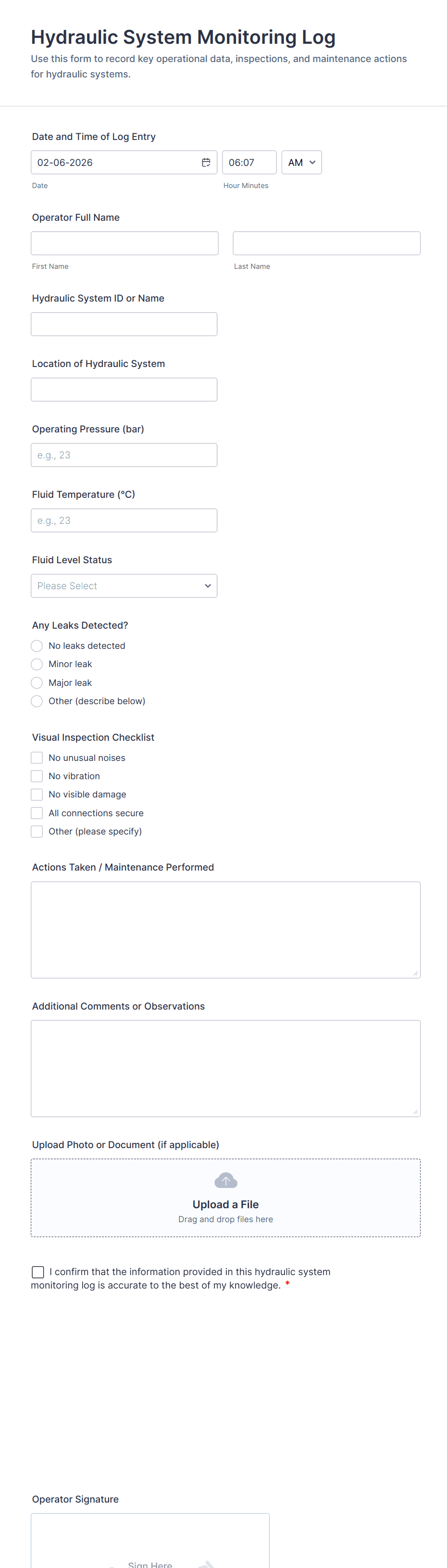 Hydraulic System Maintenance Log Form Template for documenting inspections and repairs on hydraulic equipment, helping technicians and facility teams standardize data collection and keep maintenance records organized in Jotform.