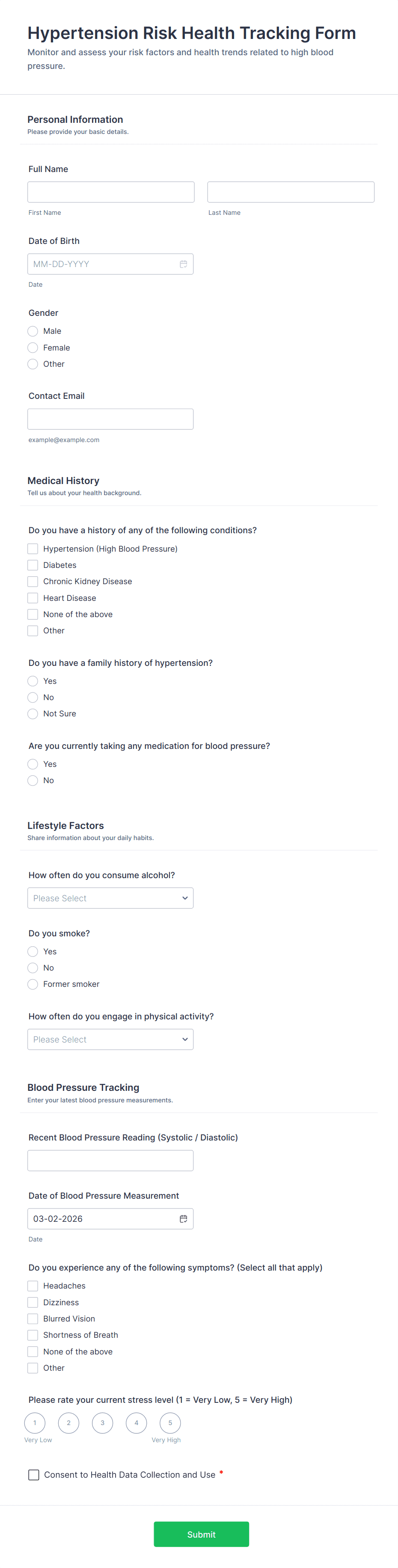 Health Tracking Forms are digital tools designed to help individuals, healthcare professionals, and organizations monitor, record, and analyze various aspects of health and wellness. These forms can be used for a wide range of purposes, such as tracking daily symptoms, monitoring medication adherence, recording vital signs, logging exercise routines, or managing chronic conditions. Whether you’re a patient managing your own health, a caregiver supporting someone else, or a medical professional overseeing multiple patients, Health Tracking Forms provide a structured and efficient way to collect and review important health data over time.