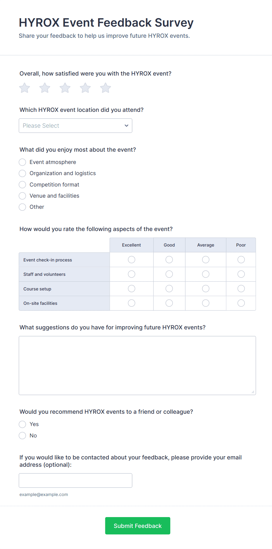 - For virtual events, include questions about technology, accessibility, and online engagement.