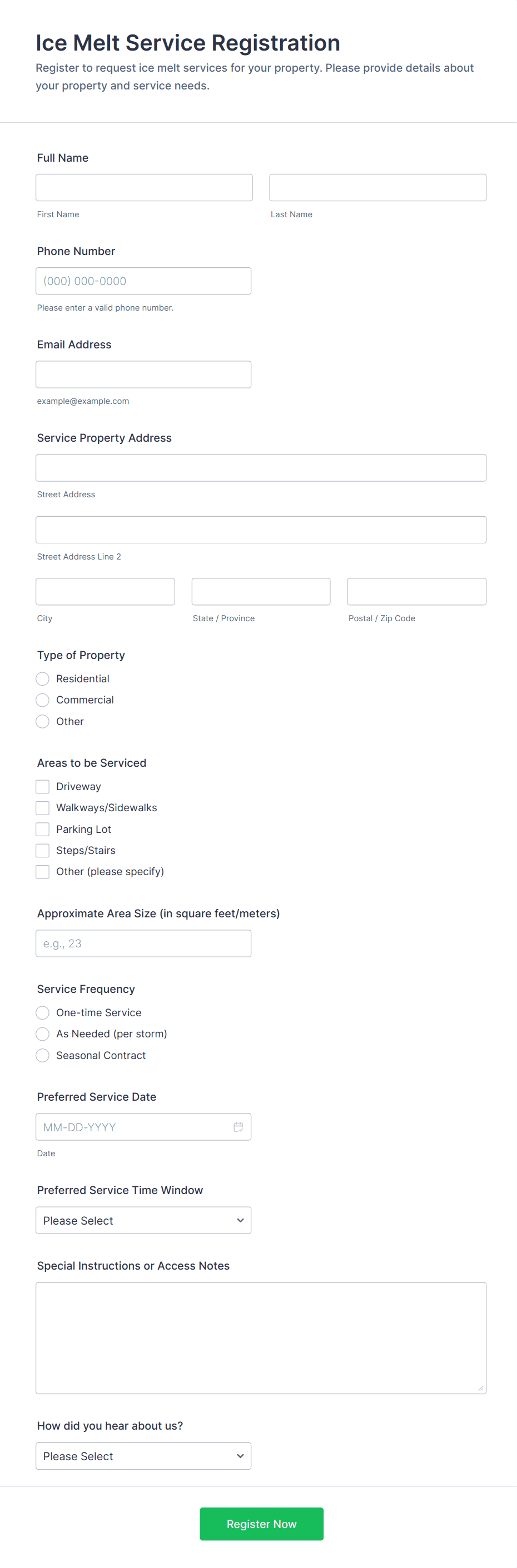 Typical fields include client contact details, service type, preferred date and time, specific requirements or descriptions, and payment information if applicable.