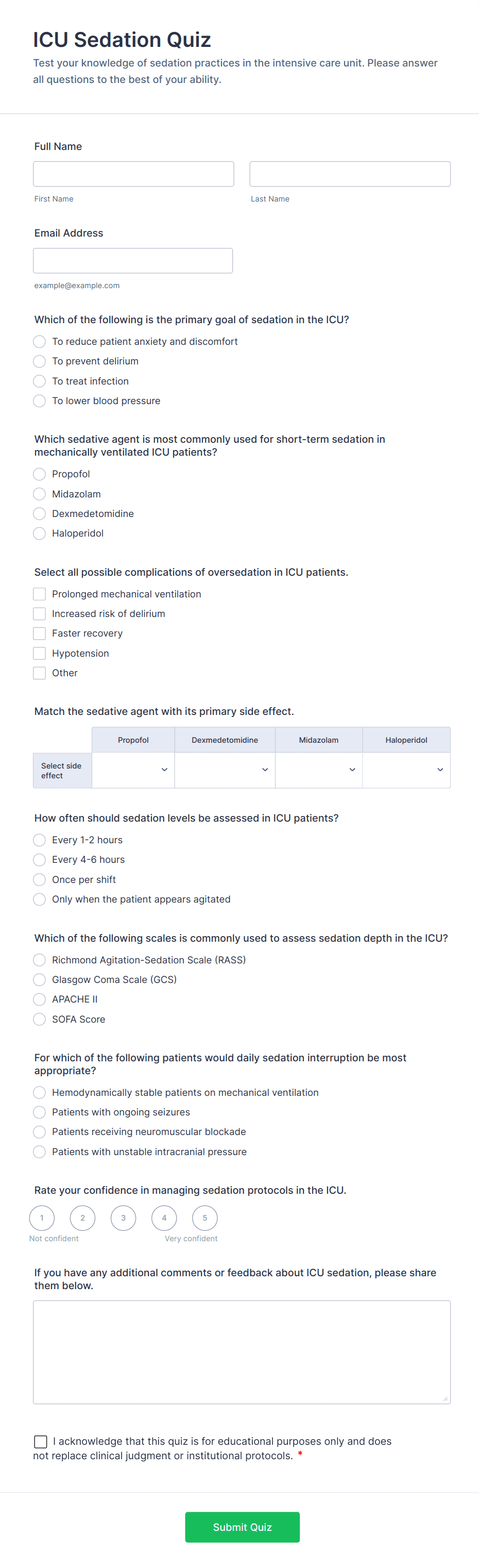 Quiz Templates are pre-designed forms specifically created to facilitate the process of building quizzes for a variety of purposes, such as education, employee training, lead generation, event engagement, and more. These templates provide a structured way to present questions, collect answers, and automatically score or evaluate responses. Whether you’re a teacher assessing student knowledge, a business running a product knowledge test, or a marketer creating a fun personality quiz, Quiz Templates offer a flexible foundation to suit your needs. They can be used for online exams, trivia games, onboarding assessments, customer feedback quizzes, and interactive learning modules.