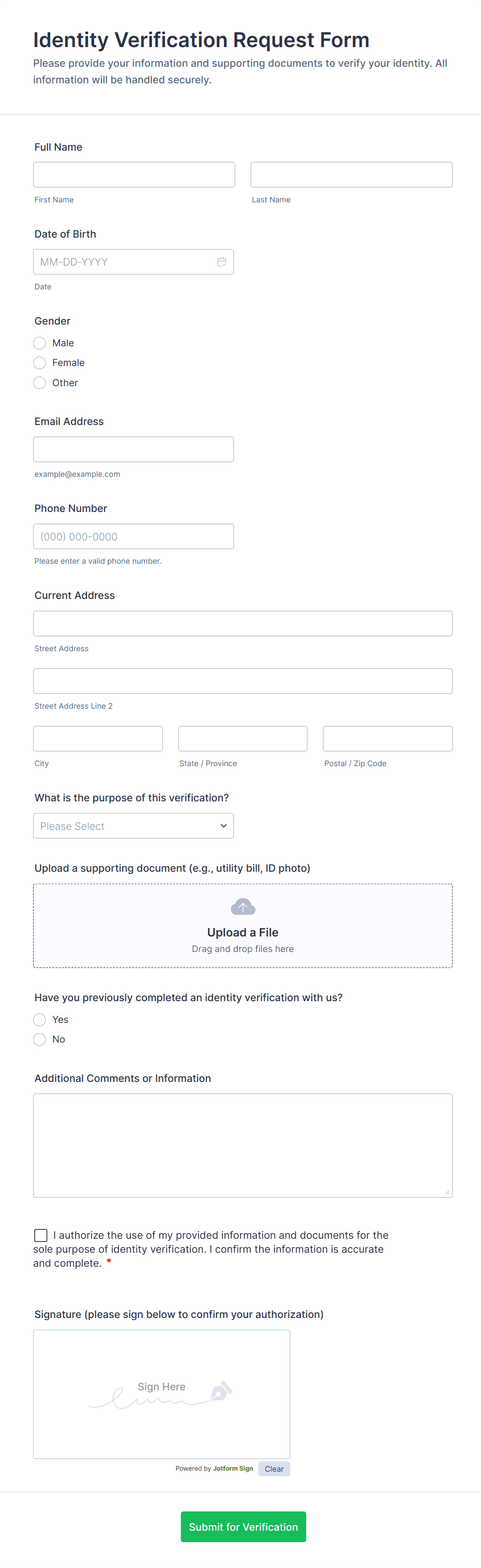 Verification forms are specialized digital tools designed to authenticate, validate, or confirm information provided by individuals or organizations. These forms are commonly used to verify identities, credentials, employment status, addresses, or other critical data points in a secure and efficient manner. Typical use cases include onboarding new employees, confirming student enrollment, validating customer identities for financial services, or ensuring the accuracy of submitted documents in compliance processes. By streamlining the verification process, these forms help organizations reduce fraud, maintain regulatory compliance, and build trust with their stakeholders.