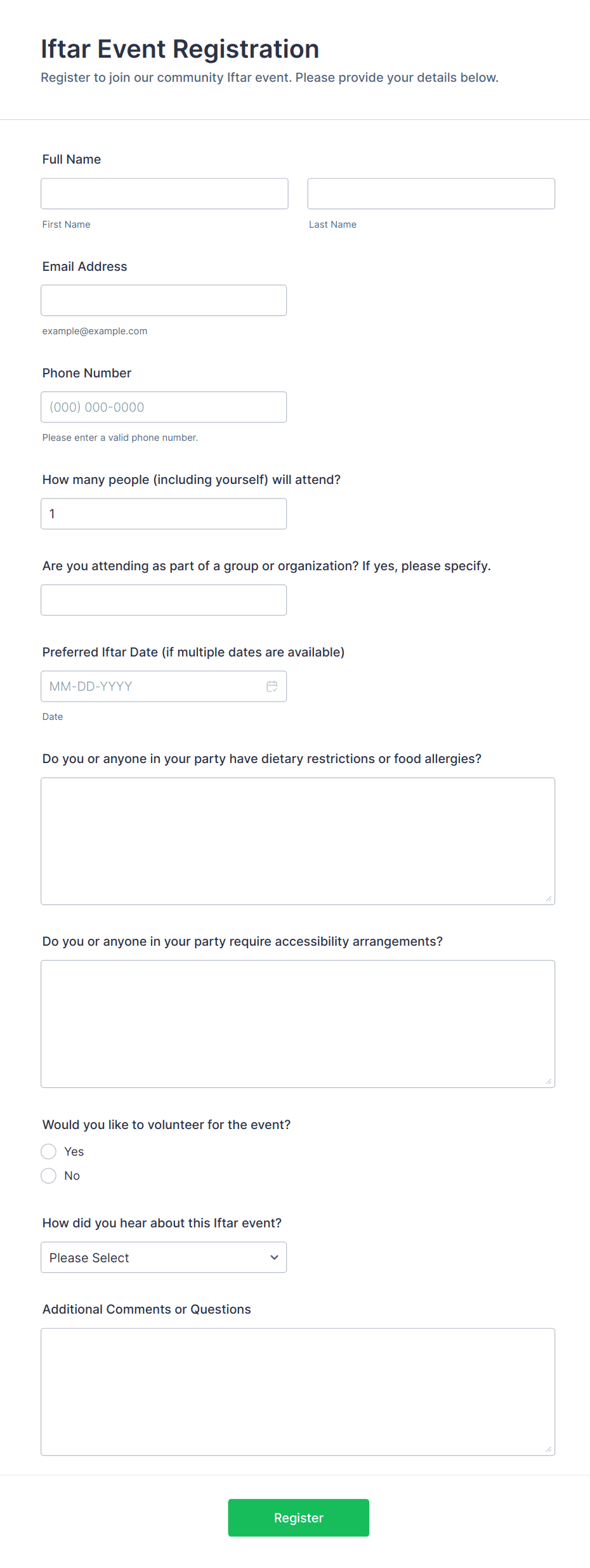 3. What information should be included in an event registration form?