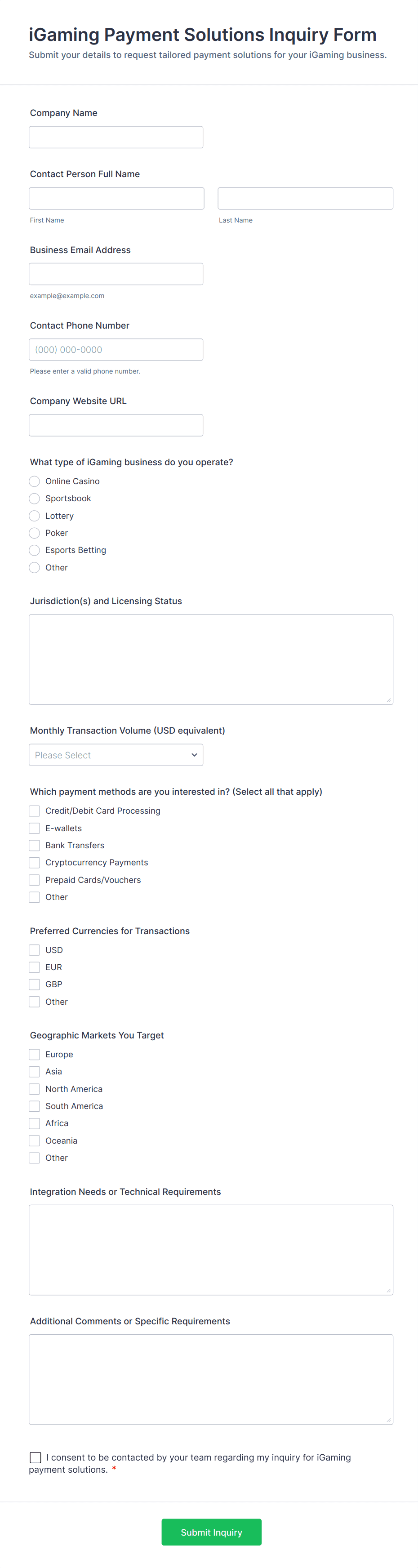 - For sales inquiries: Company Name, Contact Information, Product/Service Interest, Budget, Timeline