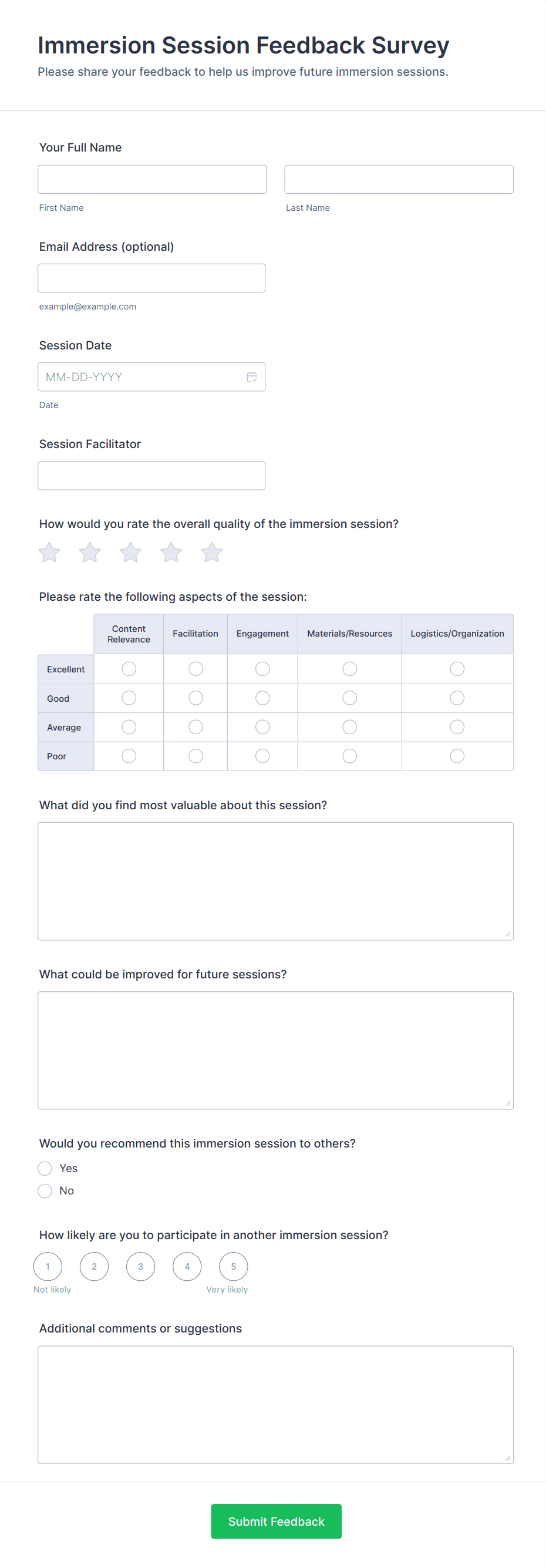 • Trainer Evaluation: Gather feedback on the effectiveness, communication skills, and engagement level of trainers or facilitators.