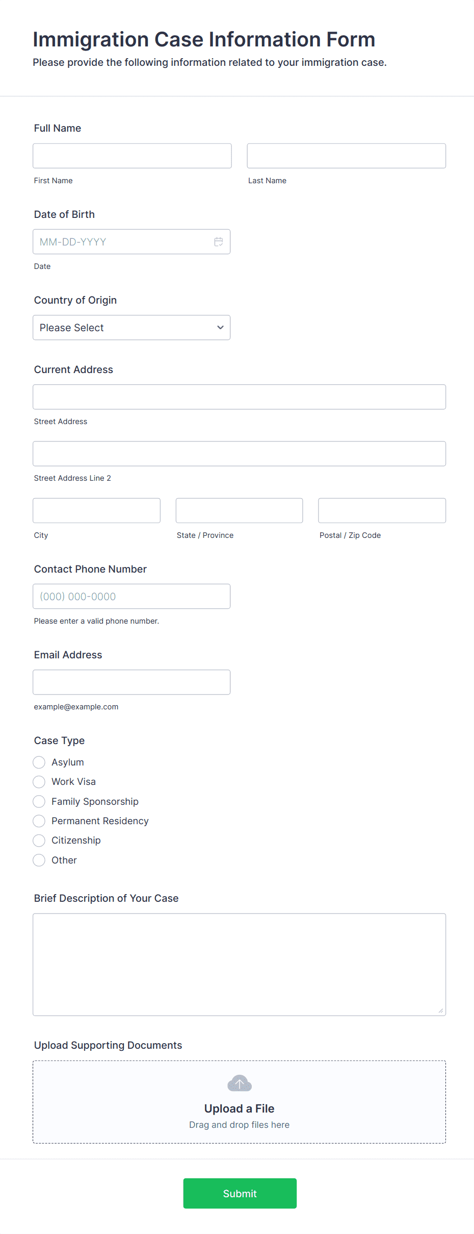• For job applications, include fields for personal information, education, work experience, references, and file uploads for resumes or cover letters.