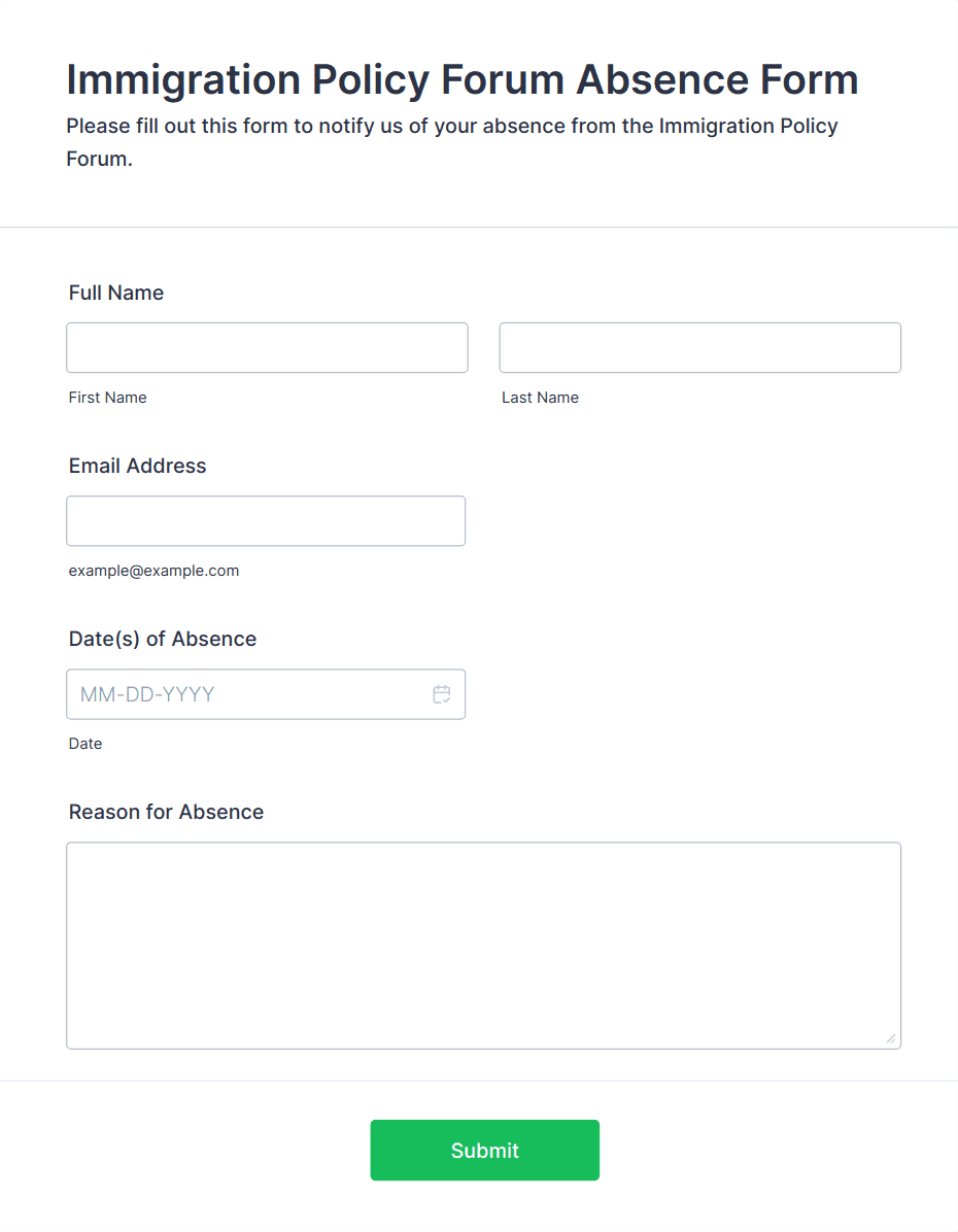 The form templates here are for informational purposes only. Jotform is not providing legal, financial, or other advice, or implying that the forms are legally valid in all or any jurisdictions. Before using any such form, consult an attorney and/or other applicable professionals to make sure that the form meets your needs, legally and otherwise.