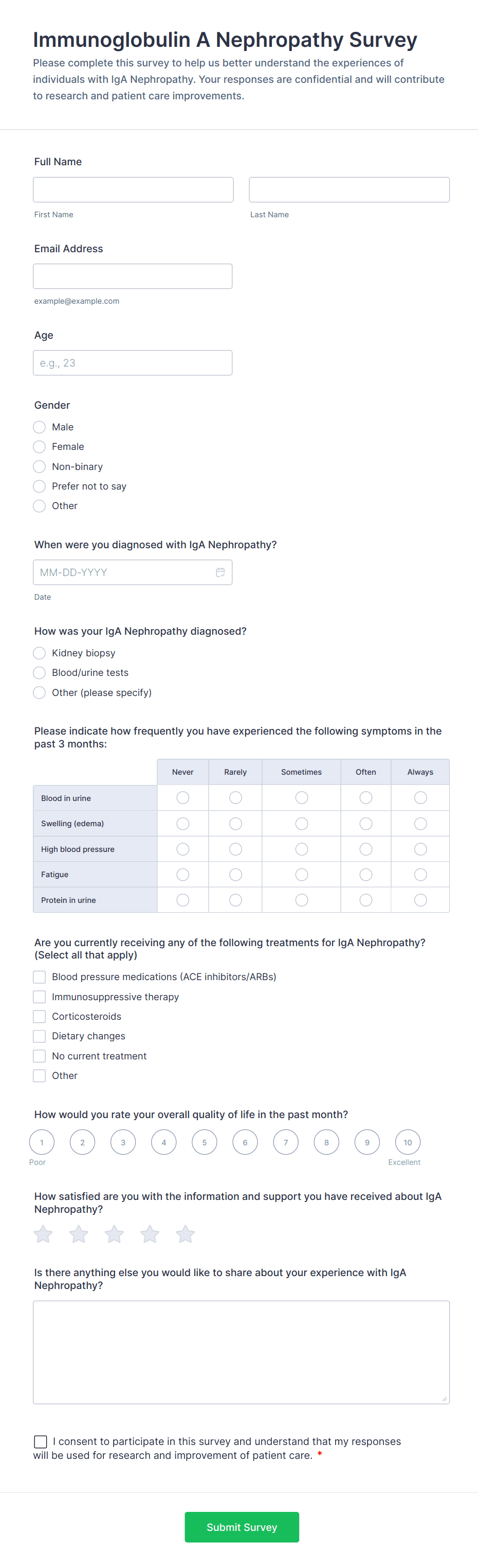Medical surveys and questionnaires are essential tools used by healthcare professionals, researchers, clinics, and organizations to collect valuable information about patients’ health, medical histories, symptoms, treatment outcomes, and overall well-being. These forms can be used for a variety of purposes, such as patient intake, health risk assessments, satisfaction surveys, mental health screenings, post-visit feedback, and clinical research studies. By gathering structured data directly from patients or study participants, medical surveys and questionnaires help streamline workflows, improve patient care, and support evidence-based decision-making in healthcare settings.