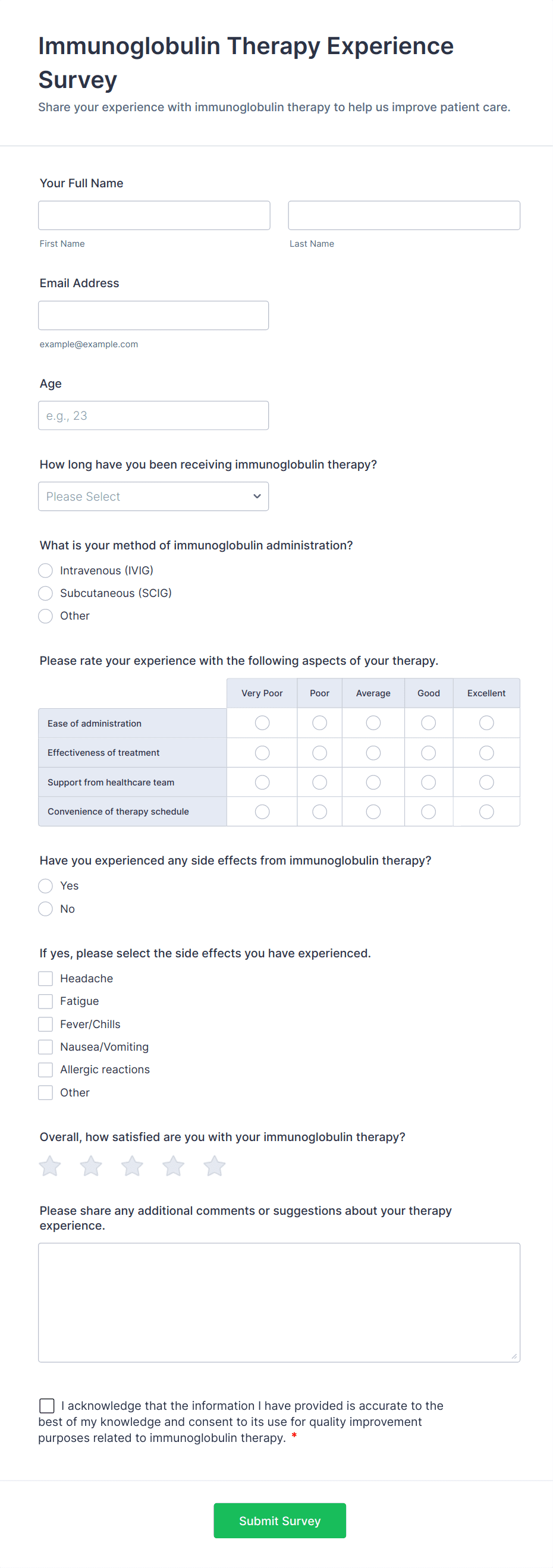 Medical surveys and questionnaires are essential tools used by healthcare professionals, researchers, clinics, and organizations to collect valuable information about patients’ health, medical histories, symptoms, treatment outcomes, and overall well-being. These forms can be used for a variety of purposes, such as patient intake, health risk assessments, satisfaction surveys, mental health screenings, post-visit feedback, and clinical research studies. By gathering structured data directly from patients or study participants, medical surveys and questionnaires help streamline workflows, improve patient care, and support evidence-based decision-making in healthcare settings.