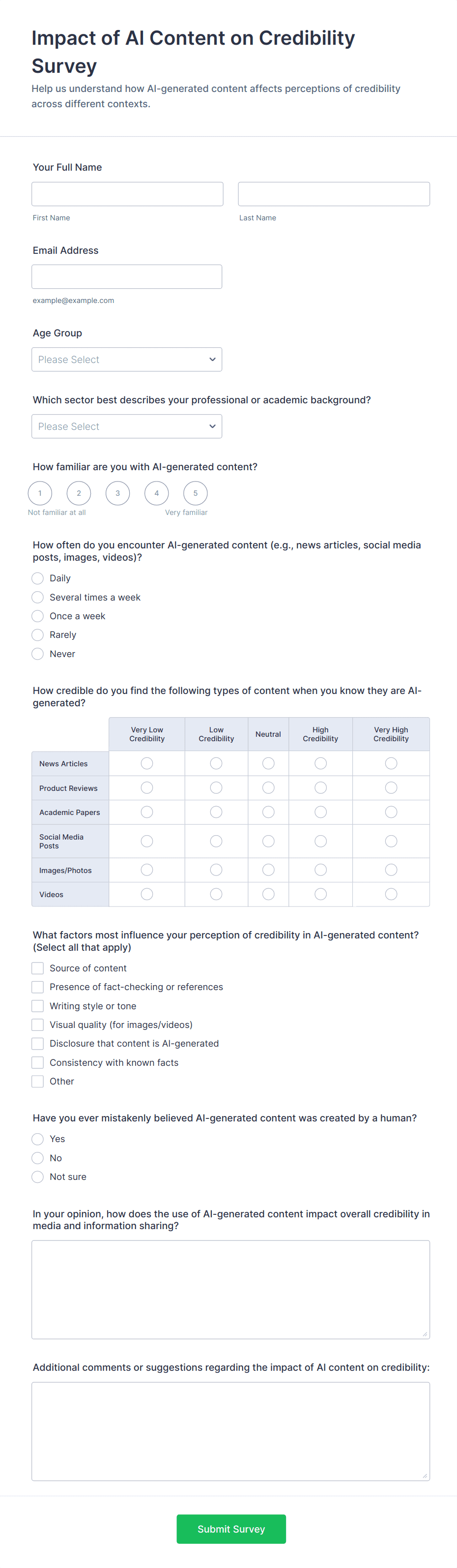 The AI-Augmented Learning Perception Survey is a Jotform Form Template that uses the Jotform Form Builder no-code form builder and drag-and-drop interface to streamline data collection and form submission about attitudes toward AI in learning.