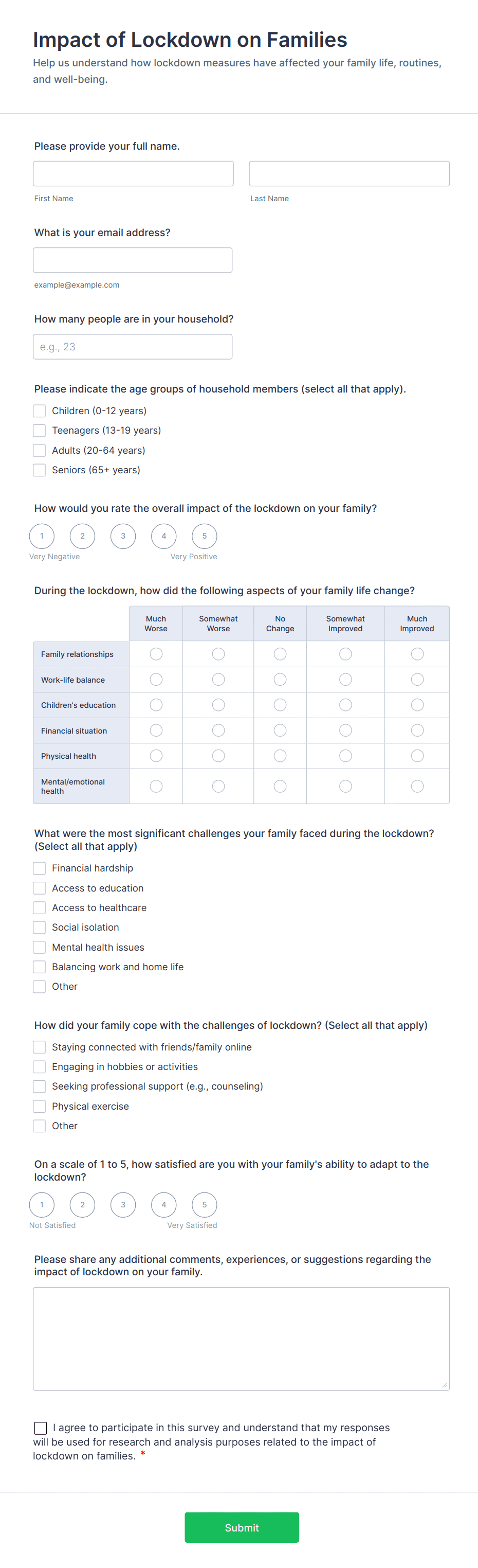 Collect household perspectives for research with the Impact of Lockdown on Families Survey Form Template in Jotform, built for online data collection and organized form submission analysis across schools, nonprofits, and community programs.