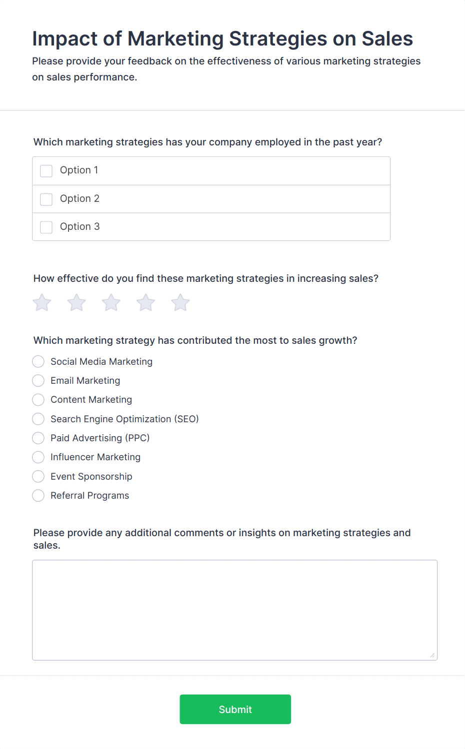 • Market Research Surveys: Incorporate demographic questions, purchasing behavior, and competitor analysis.