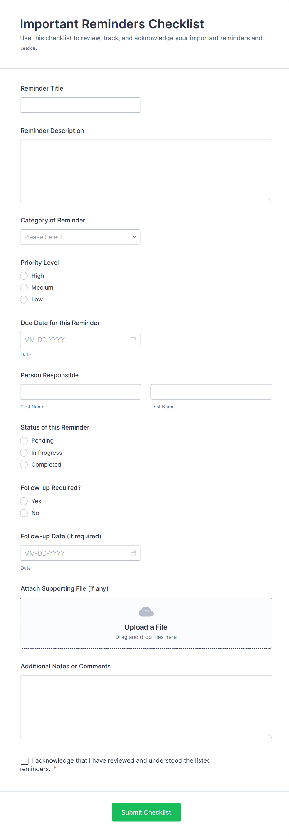 • For more complex checklists, add dropdowns, file upload fields (for attaching evidence or reports), or signature fields (for verification).