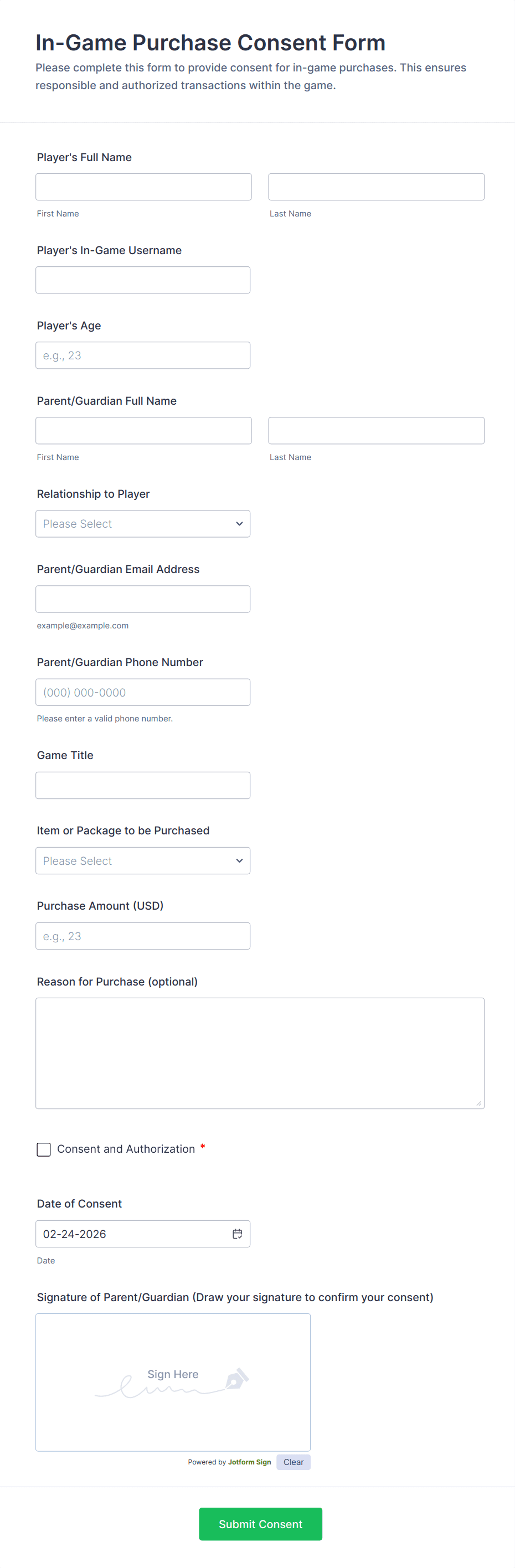 Get permission from parents and guardians to let their children participate in your program. Free parental consent form. Easy to customize and embed. No coding required.