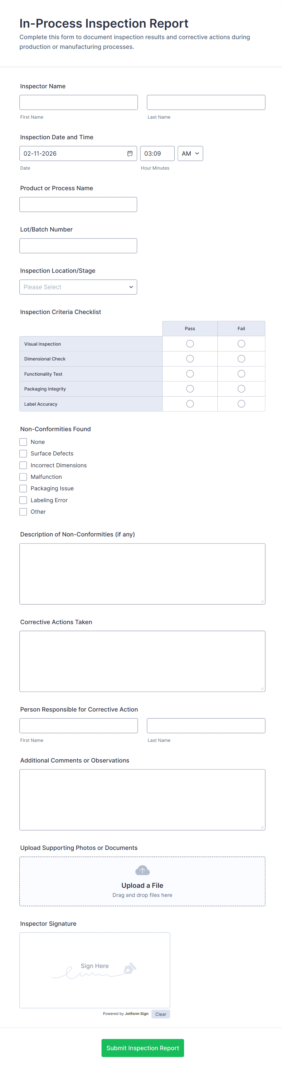 Creating an effective inspection form with Jotform is straightforward and highly customizable, allowing you to address the unique requirements of your inspection process. Whether you’re conducting safety audits, equipment checks, or property walkthroughs, Jotform’s platform ensures your forms are comprehensive, user-friendly, and accessible from any device.