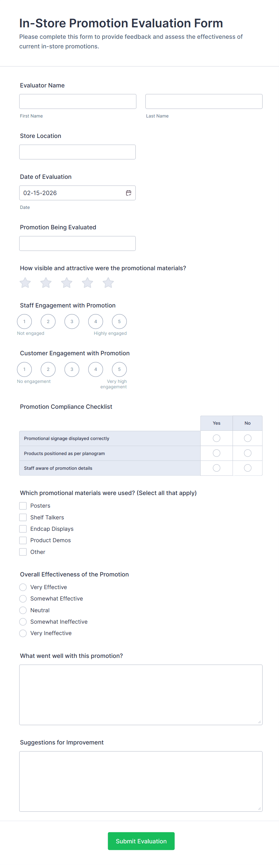 An evaluation form is a structured document or online tool used to collect feedback, assess performance, or measure satisfaction in various settings such as workplaces, schools, events, or customer interactions.