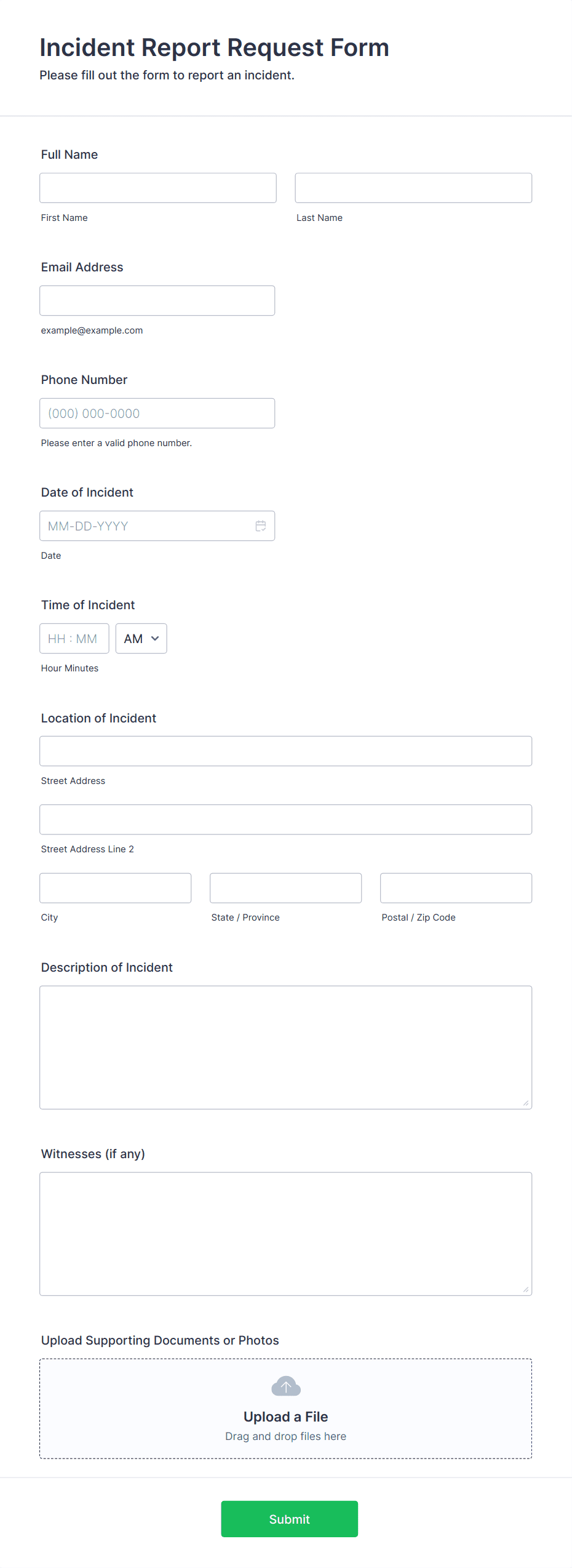 An incident report form is a structured document used to record details about unexpected events, accidents, or near-misses in various settings. It helps organizations document what happened, who was involved, and what actions were taken.
