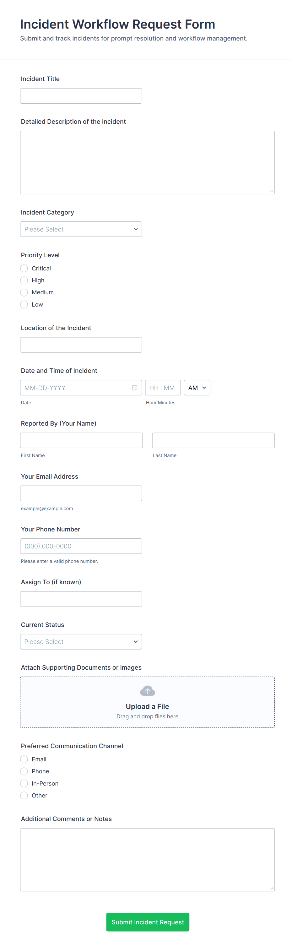 Common fields include requester’s name, contact details, department, type of request, detailed description, urgency, and any relevant attachments.