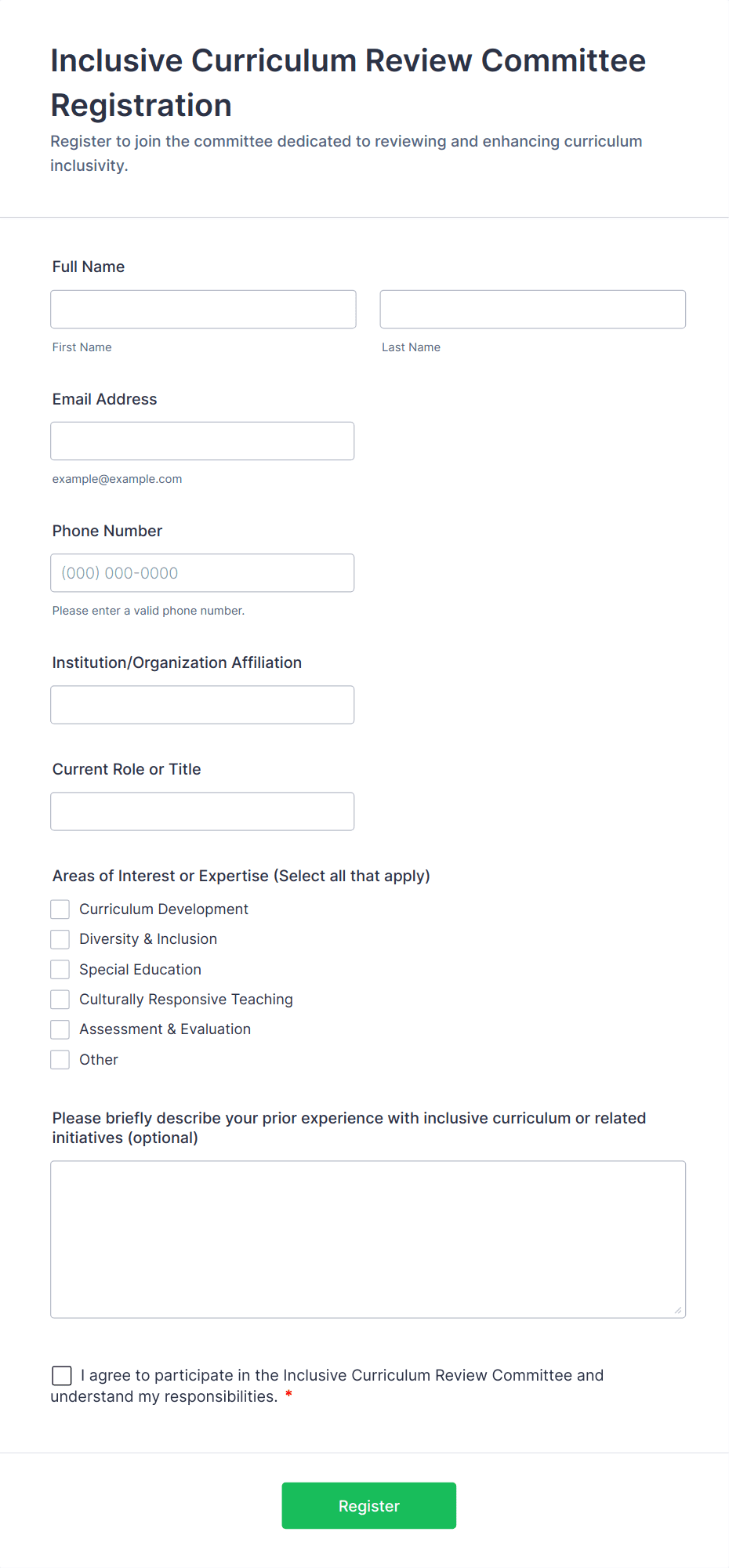 The form templates here are for informational purposes only. Jotform is not providing legal, financial, or other advice, or implying that the forms are legally valid in all or any jurisdictions. Before using any such form, consult an attorney and/or other applicable professionals to make sure that the form meets your needs, legally and otherwise.