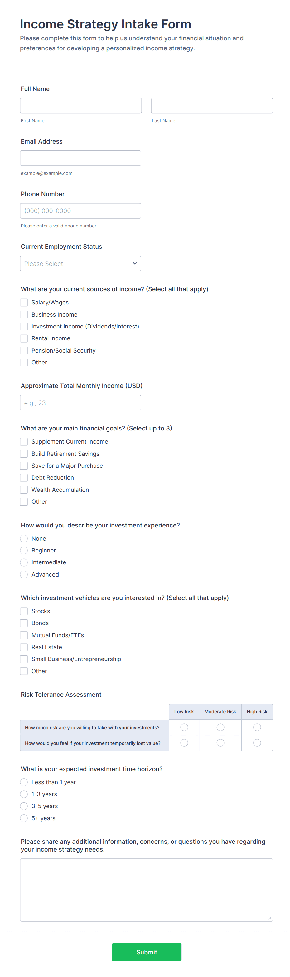 Give your clients peace of mind with Jotform’s secure online Financial Advisor Forms. From any device you can gather client intake information, W4 and W9 data, and finance declaration forms and applications. Choose from one of our free form templates below, and customize it to make it your own without any coding with just a few clicks. Drag and drop to edit premade text fields and checklist items, add your own personal branding, install widgets, choose fonts and colors, and more. You can also charge clients directly from your form with our 30+ payment processor integrations — which charge no additional transaction fees. Sensitive client information is instantly synced and stored in your secure online account. Create a seamless intake process for your clients with our free Financial Advisor Forms.