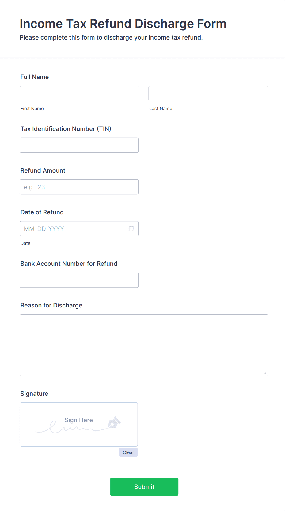 Common fields include personal or business identification details, tax identification numbers, income amounts, deductions, filing status, and supporting documentation such as receipts or invoices.