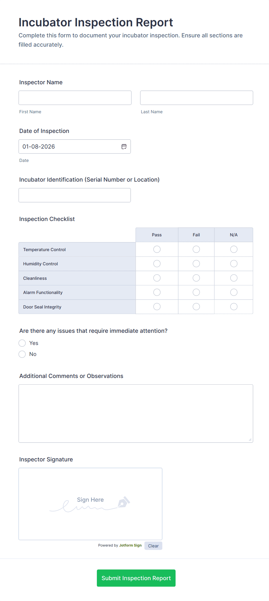 The form templates here are for informational purposes only. Jotform is not providing legal, financial, or other advice, or implying that the forms are legally valid in all or any jurisdictions. Before using any such form, consult an attorney and/or other applicable professionals to make sure that the form meets your needs, legally and otherwise.