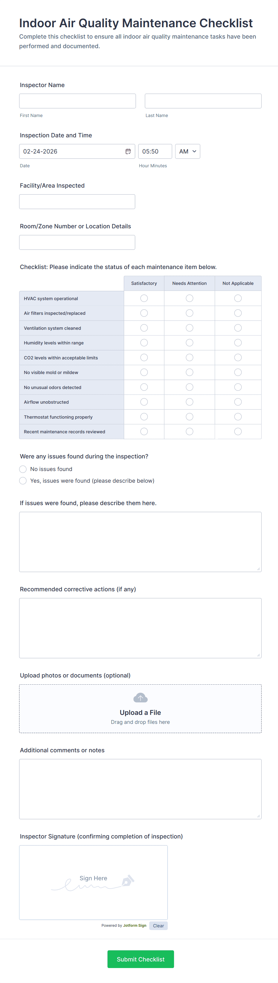 Document routine ceiling inspections with the Ceiling Inspection Checklist Form, ideal for property managers, maintenance teams, and inspectors who need consistent records, photo support, and organized form submission tracking in Jotform.