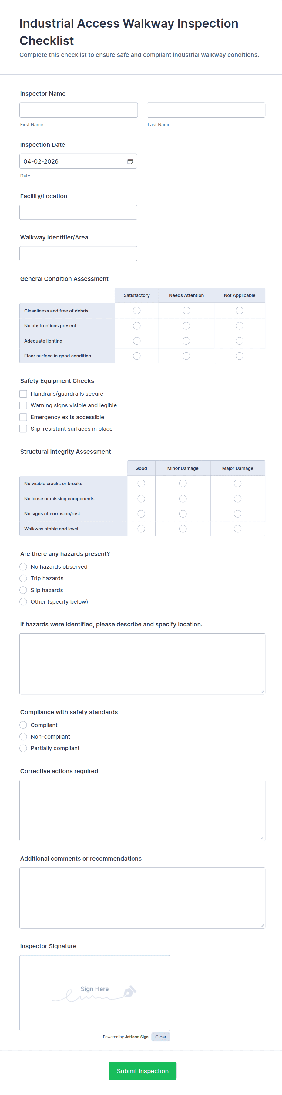 A facility safety inspection checklist is used by an inspector to conduct a thorough review of a facility to determine its compliance with safety laws and regulations. Keep track of the inspection results with Jotform.