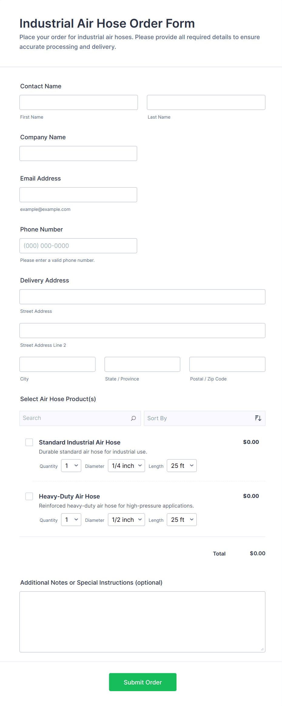 • For wholesale or custom orders, include fields for bulk pricing, tax information, or file uploads for specifications.