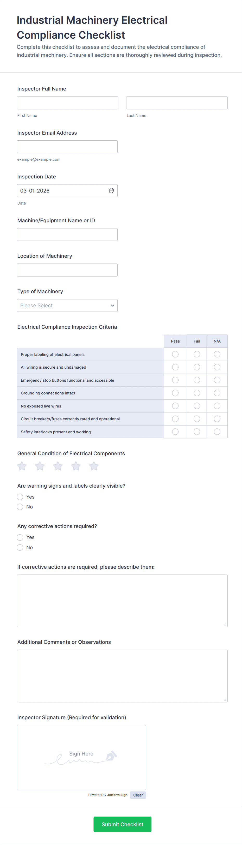 A facility safety inspection checklist is used by an inspector to conduct a thorough review of a facility to determine its compliance with safety laws and regulations. Keep track of the inspection results with Jotform.