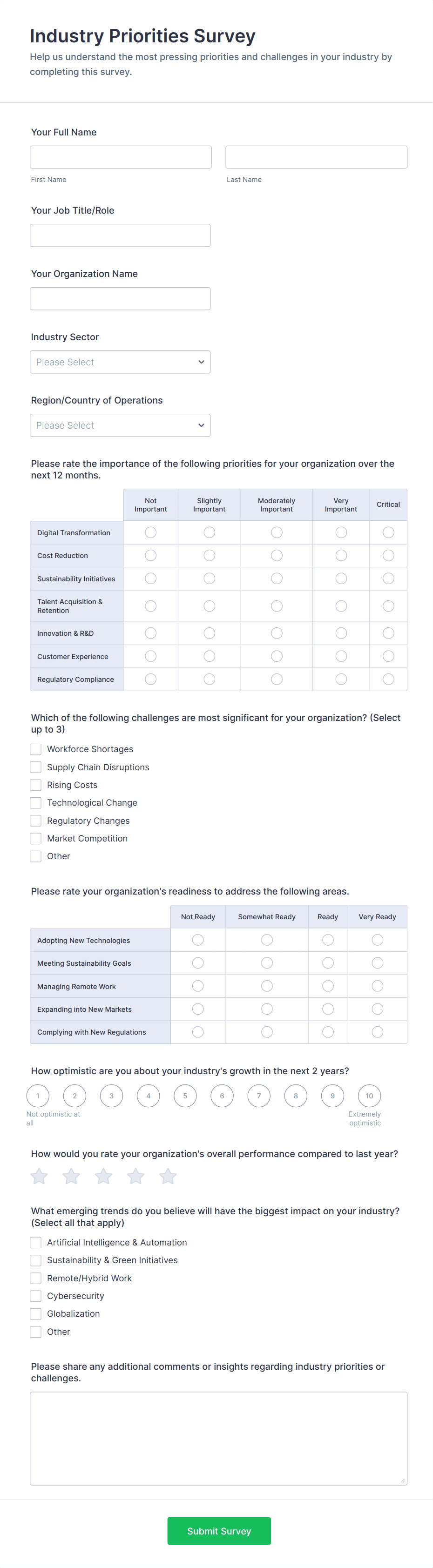 Business surveys are essential tools for organizations seeking to gather actionable insights, measure performance, and drive informed decision-making. These surveys can cover a wide range of topics, including customer satisfaction, employee engagement, market research, product feedback, and internal process evaluations. By systematically collecting feedback from customers, employees, partners, or stakeholders, businesses can identify strengths, uncover areas for improvement, and adapt strategies to meet evolving needs. Whether you’re a small business owner, HR manager, marketing professional, or executive, business surveys help you stay connected to your audience and make data-driven choices that foster growth and efficiency.