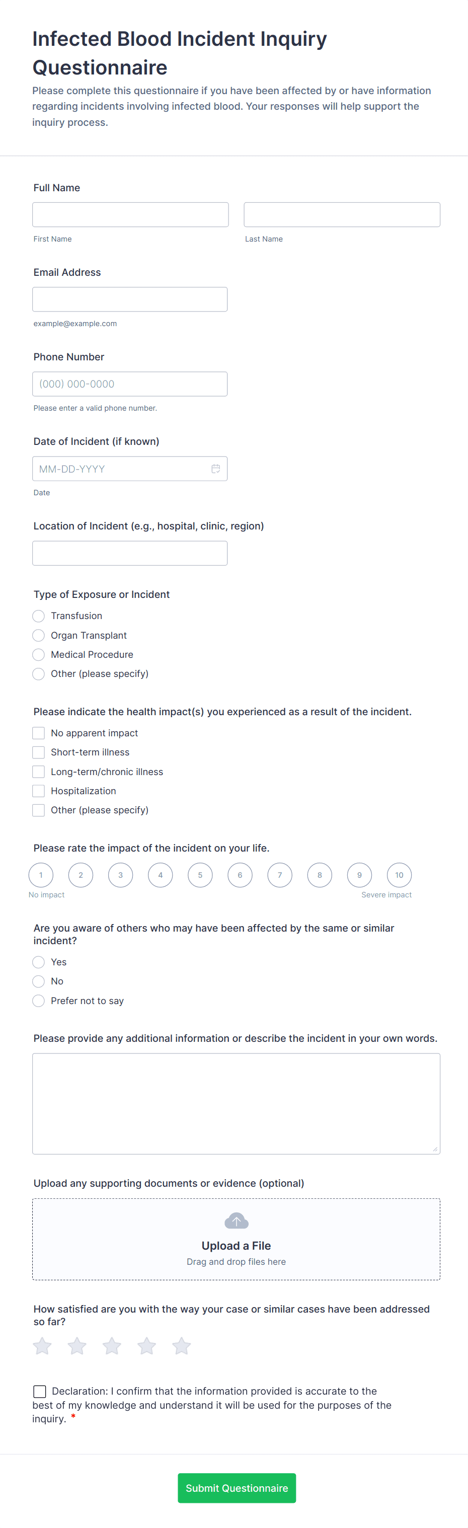 Questionnaire templates are pre-designed forms used to collect structured information from respondents for a variety of purposes, such as research, feedback, assessments, and evaluations. These templates can be tailored to suit different industries and objectives, including customer satisfaction surveys, employee engagement assessments, academic research, health screenings, and market research studies. By providing a consistent framework for gathering data, questionnaire templates help organizations and individuals streamline the process of collecting, analyzing, and acting on valuable insights.