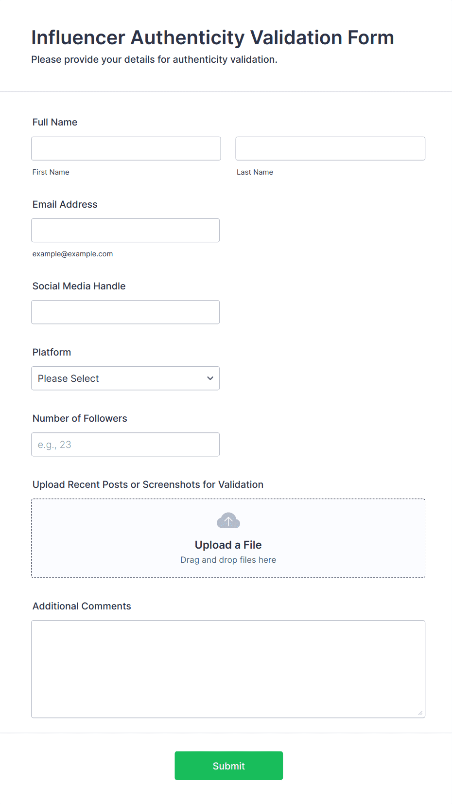 An influencer form is an online form used to collect, organize, and manage information related to influencer marketing activities, such as applications, campaign sign-ups, content submissions, and feedback.
