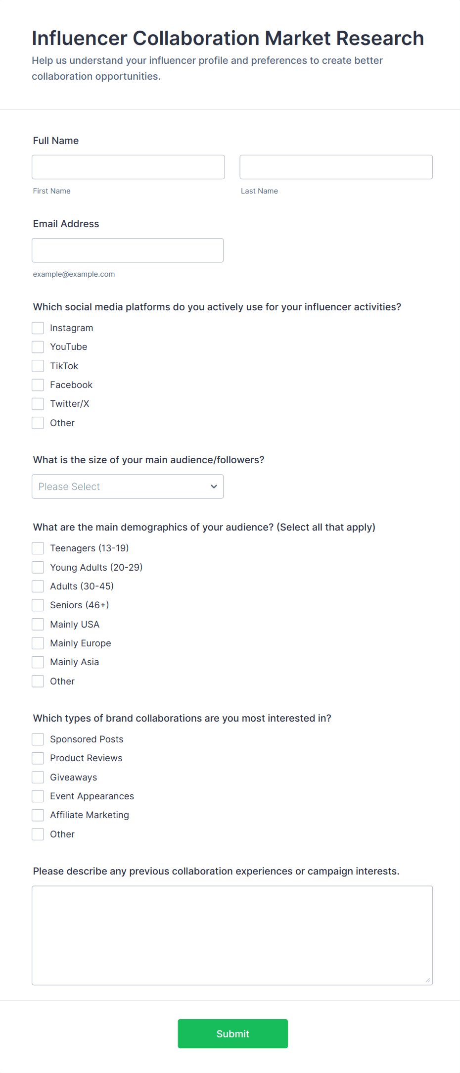 An Influencer Collaboration Form is a form template designed to gather all necessary information from influencers to ensure a successful partnership.