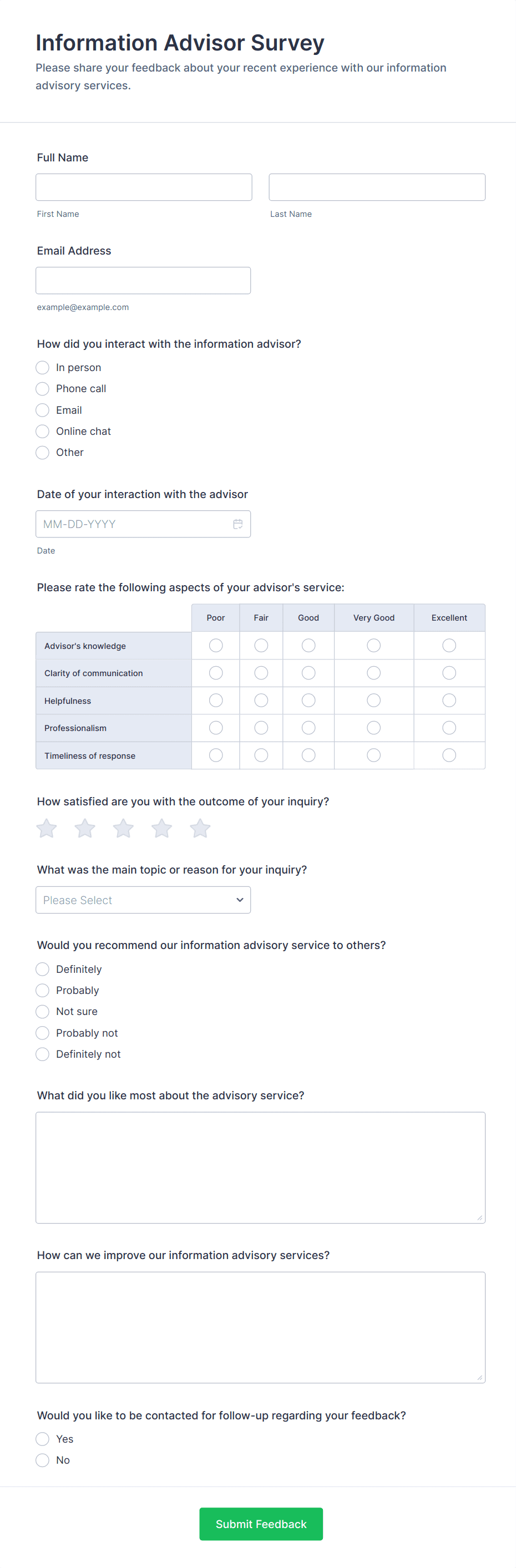 • For customer feedback, include questions about satisfaction, product quality, and likelihood to recommend.