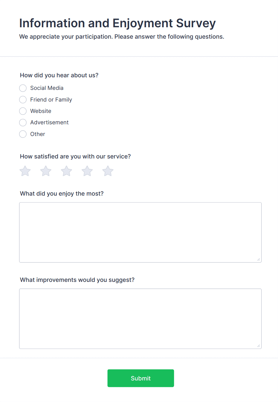 Survey templates are pre-designed forms that help individuals and organizations collect feedback, opinions, or data from a target audience. These templates are widely used for a variety of purposes, such as customer satisfaction surveys, employee engagement assessments, market research, event feedback, and academic studies. By providing a structured set of questions, survey templates streamline the process of gathering valuable insights, making it easier to analyze trends, measure satisfaction, and make informed decisions. Whether you’re a business owner, HR professional, educator, or researcher, survey templates offer a quick and effective way to reach your audience and collect actionable information.