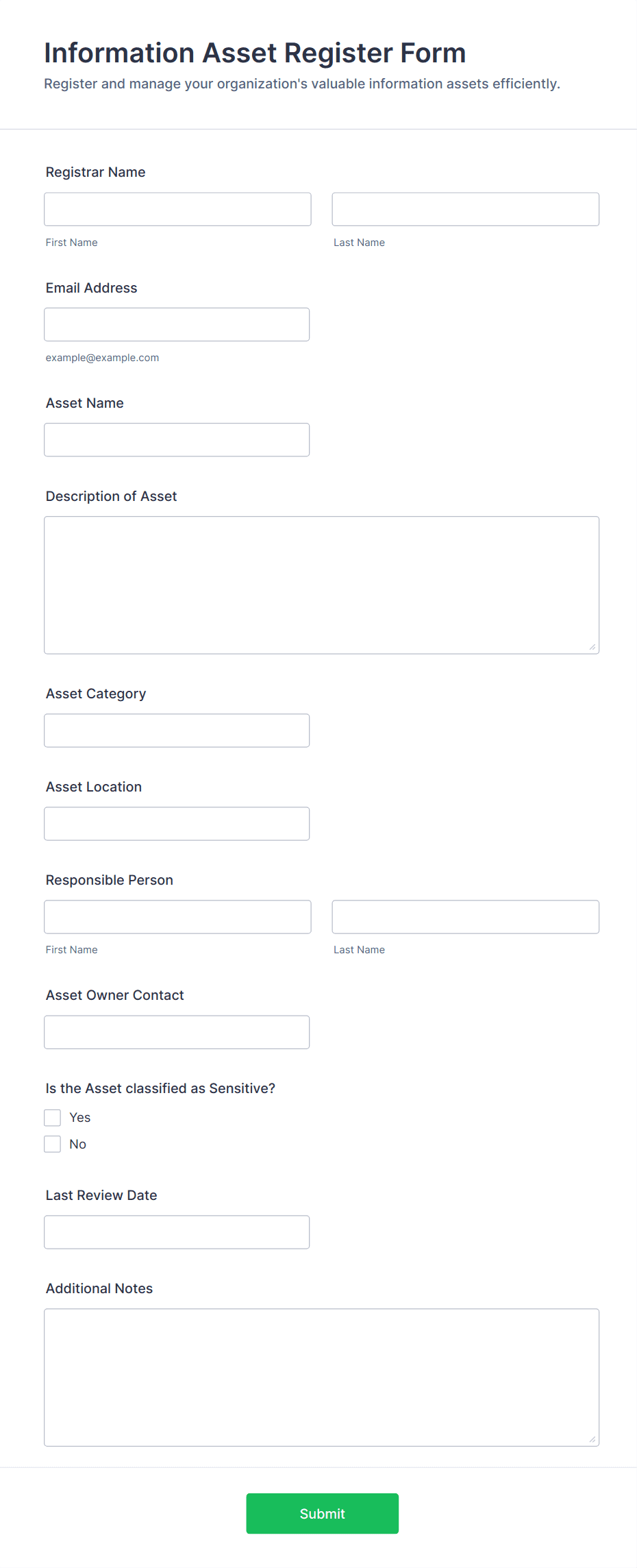 Asset Tracking Forms are specialized digital tools designed to help organizations monitor, record, and manage their physical or digital assets efficiently. These forms are commonly used to log details about equipment, inventory, vehicles, IT hardware, or any valuable property, ensuring that assets are accounted for throughout their lifecycle. Typical use cases include tracking asset check-ins and check-outs, scheduling maintenance, recording asset conditions, and managing asset assignments to employees or departments. By centralizing asset information, these forms help reduce loss, improve accountability, and streamline audits or compliance processes.