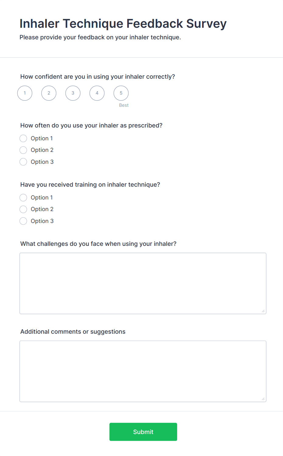 • Health-specific fields: Multiple choice for symptoms, rating scales for satisfaction, long text for open feedback.