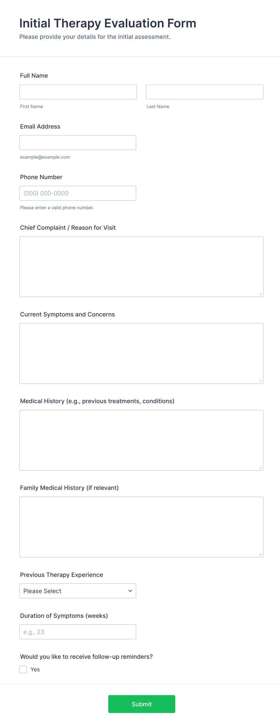 Add sections for concerns or goals, symptom descriptions, duration, and impact on daily life. Use rating scales or multiple-choice questions for mood, stress, or anxiety levels, and include open-text fields only where additional context is helpful.