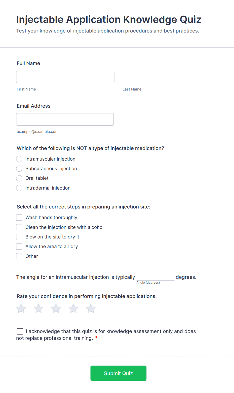 Simple Quiz Template is a form solution for educators and trainers. It streamlines the quiz creation process, allowing customizable questions and automatic grading. Enhance learning experiences effortlessly.