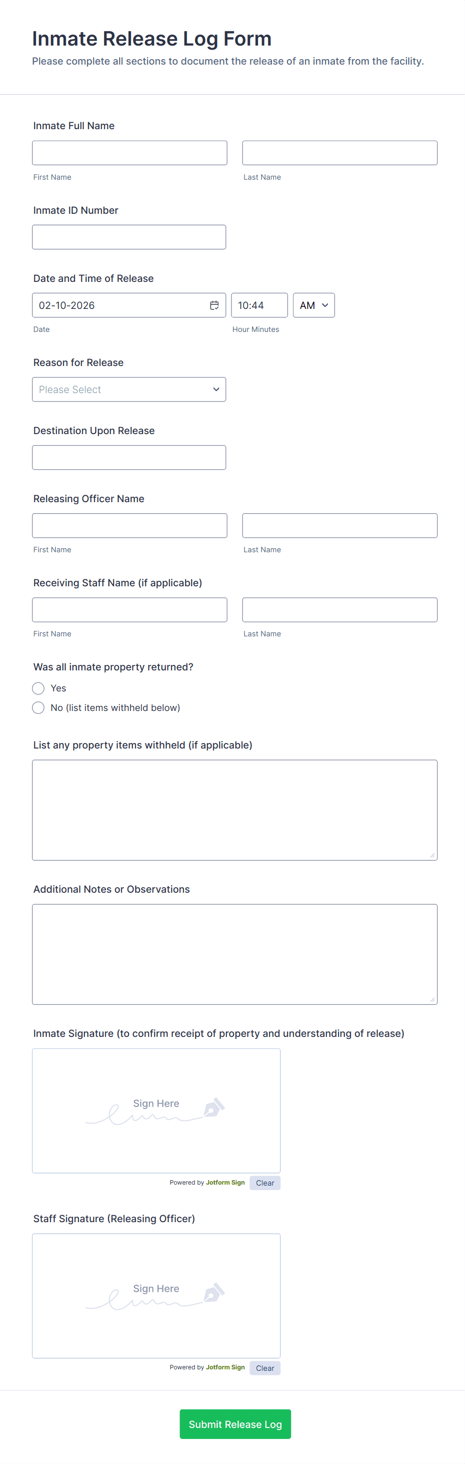 - Problem Solved: Documents the release of inmates or clients, ensuring all legal and procedural requirements are met.