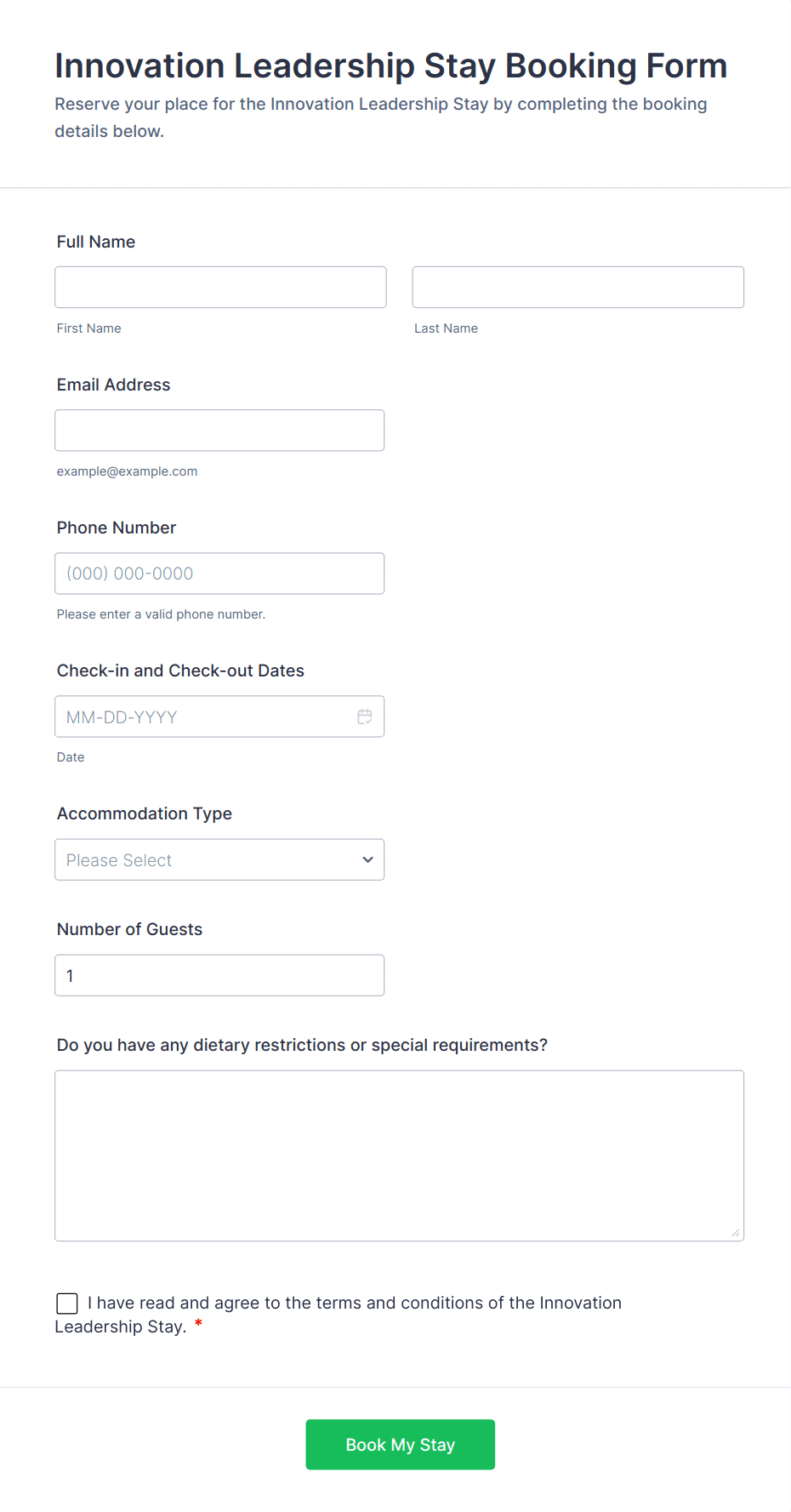 • Content and Fields: A concert booking form may require seat selection and payment integration, while a workshop sign-up might focus on participant details and session preferences. Private event RSVPs may include meal choices or guest information, whereas facility reservations could need date/time selectors and equipment checklists.
