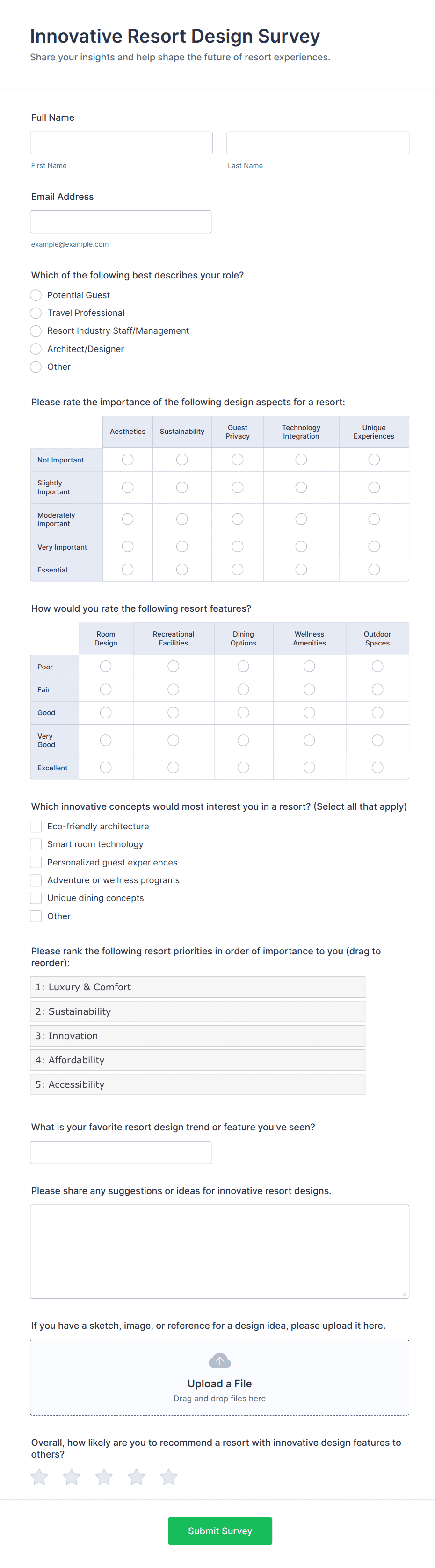 • Hospitality feedback and experience forms prioritize service quality ratings, staff interaction feedback, and open-ended guest comments.