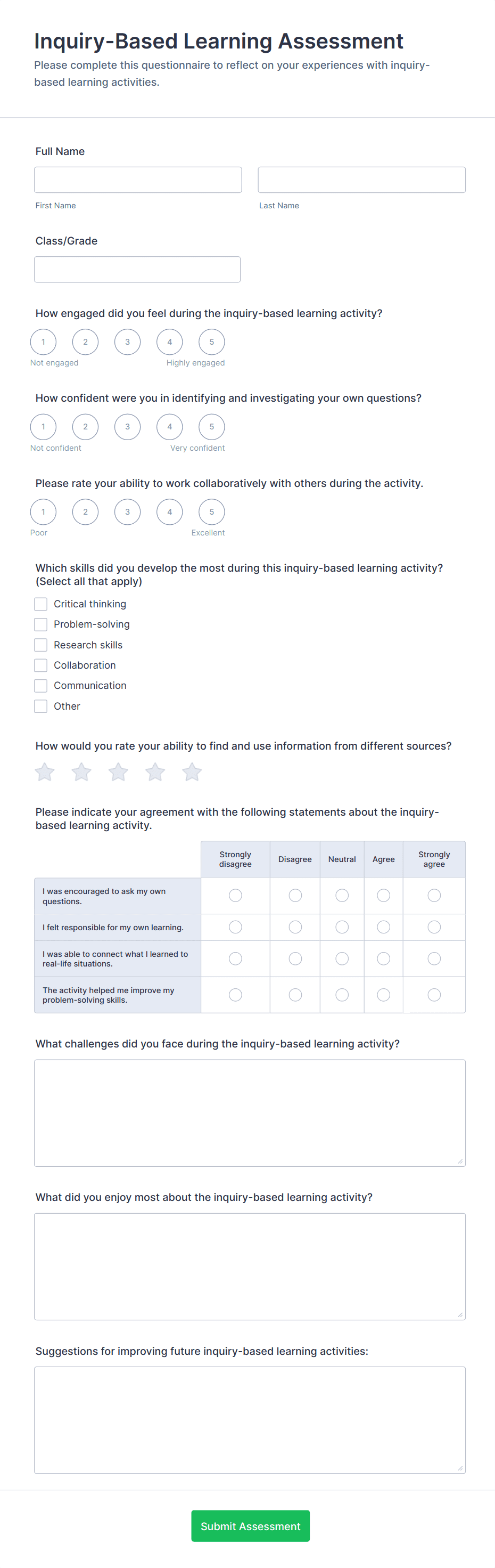 Assessment forms may include personal details, multiple-choice or open-ended questions, rating scales, comment sections, and sometimes automated scoring or feedback fields, depending on the purpose.