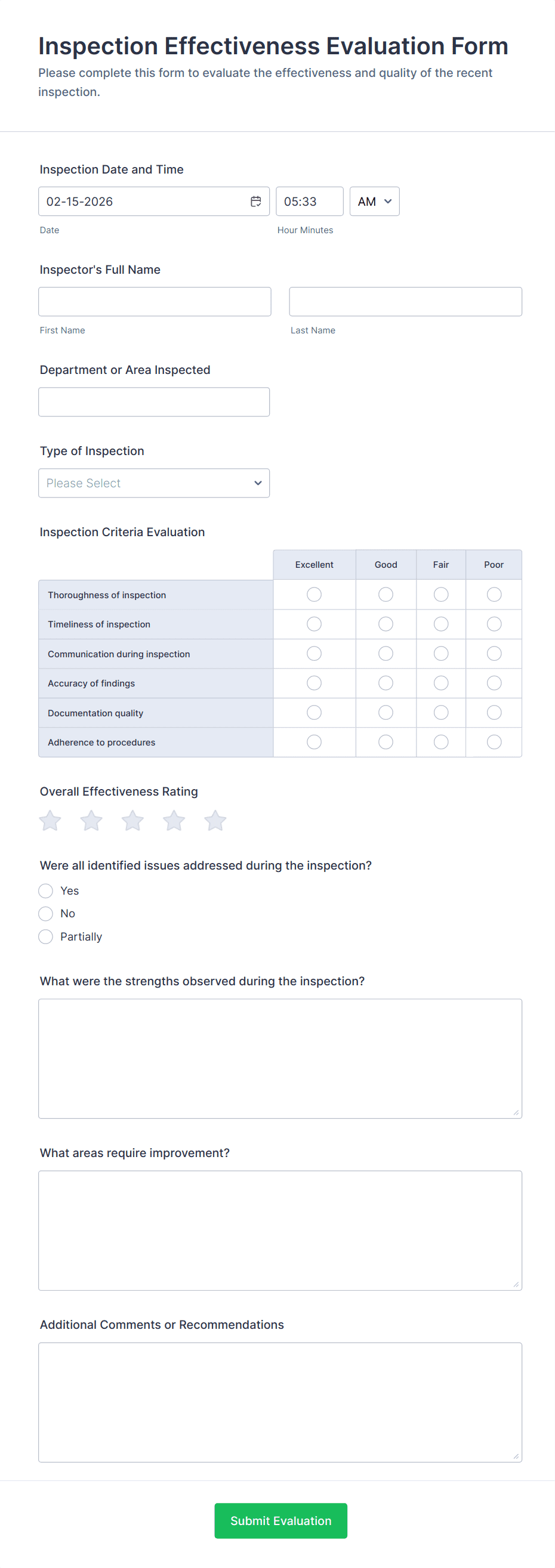 An inspection form is a structured document used to assess, record, and report the condition, compliance, or quality of assets, environments, or processes during an inspection.