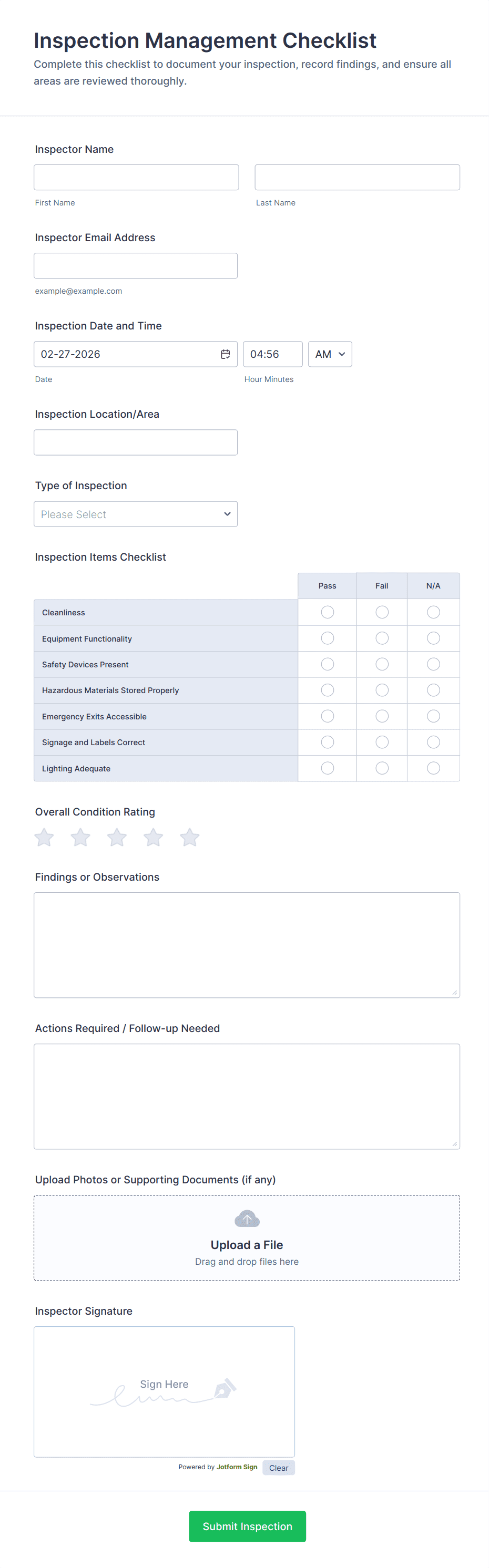 An inspection form is a structured document used to assess, record, and report the condition, compliance, or quality of assets, environments, or processes during an inspection.