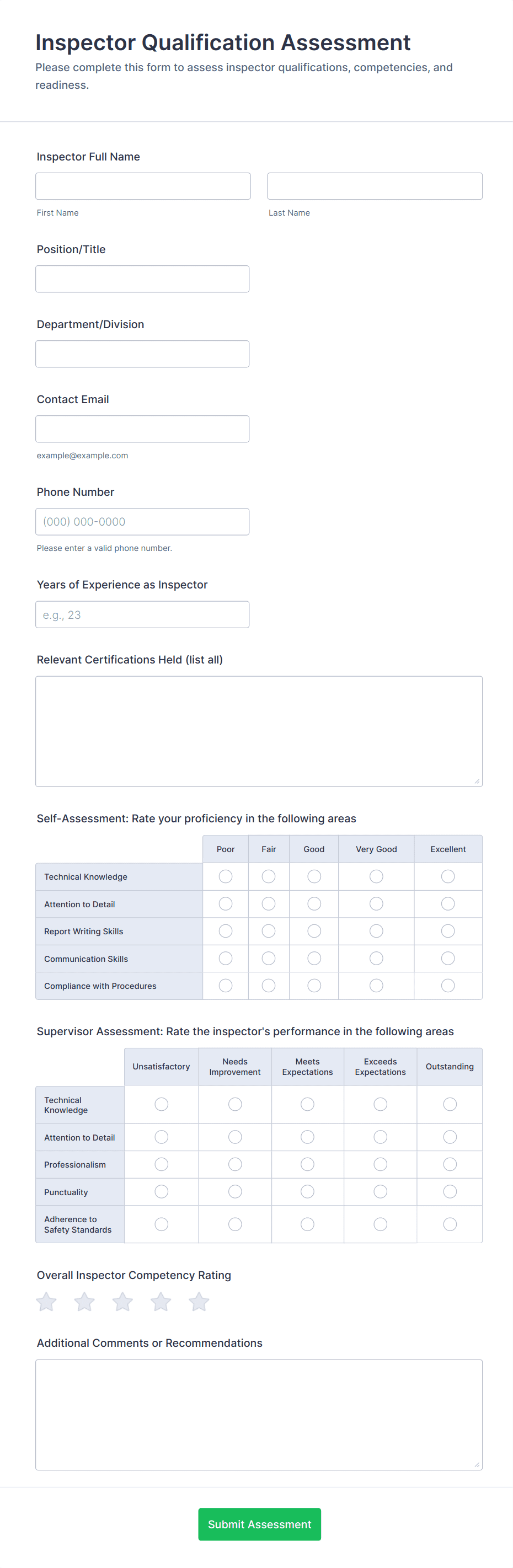 An inspection form is a structured document used to assess, record, and report the condition, compliance, or quality of assets, environments, or processes during an inspection.