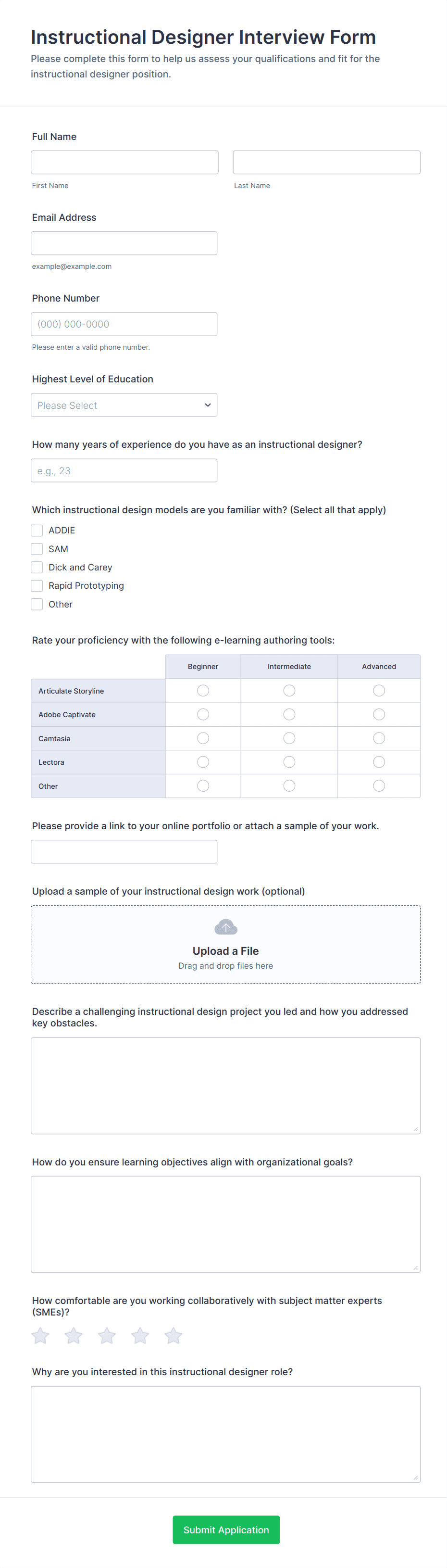 An interview form is a structured document or digital tool used to collect information from individuals during interviews. It standardizes the questions and response formats, ensuring consistency and efficiency in data collection.