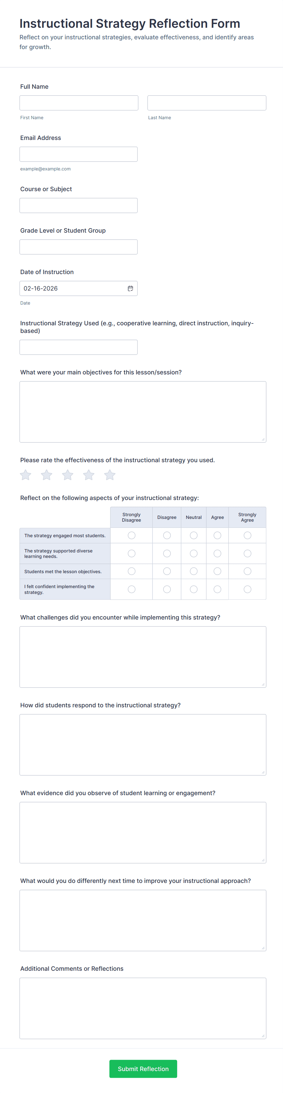 Include basic context such as the course or subject and date of instruction, plus prompts that help you evaluate outcomes like an effectiveness rating and notes on student learning evidence, challenges, and adjustments you would make next time.