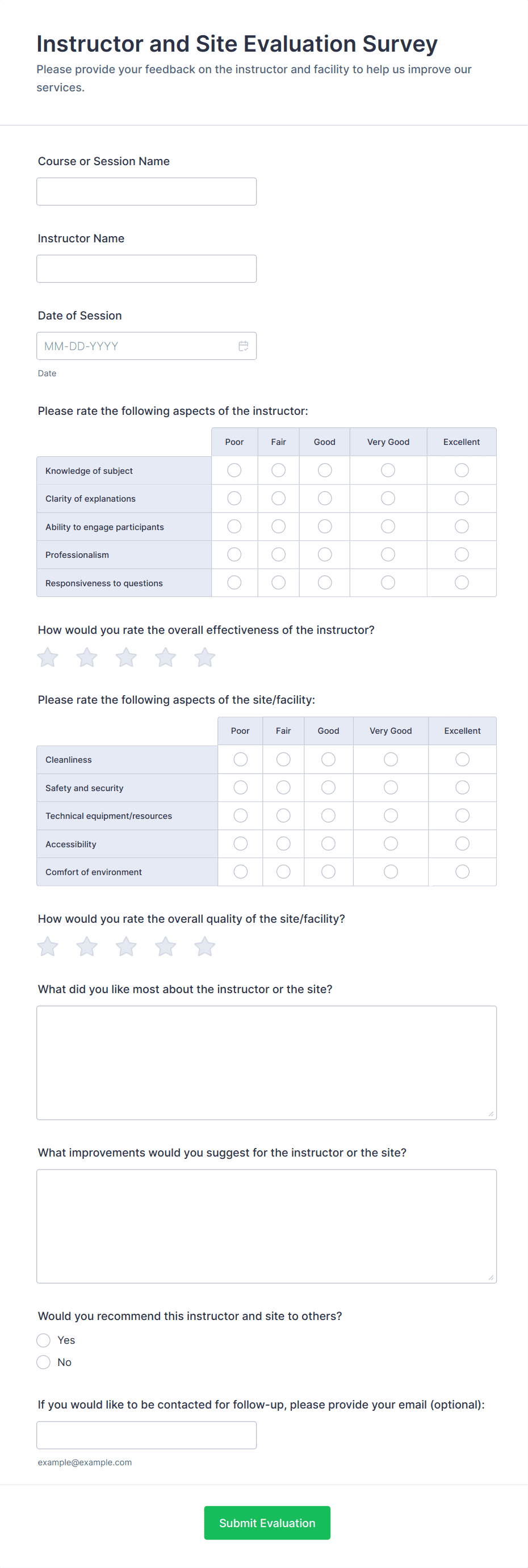 • Multiple choice or rating scale questions (e.g., “Rate the instructor’s effectiveness”)